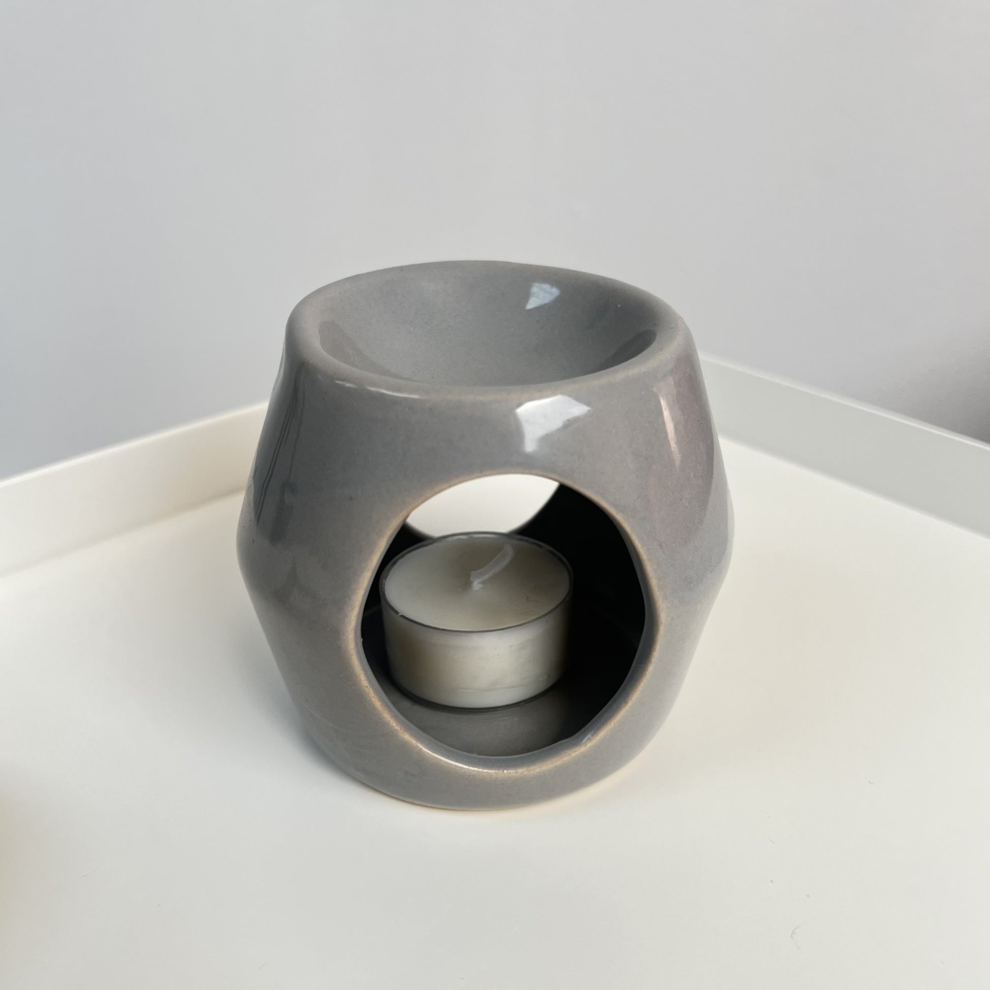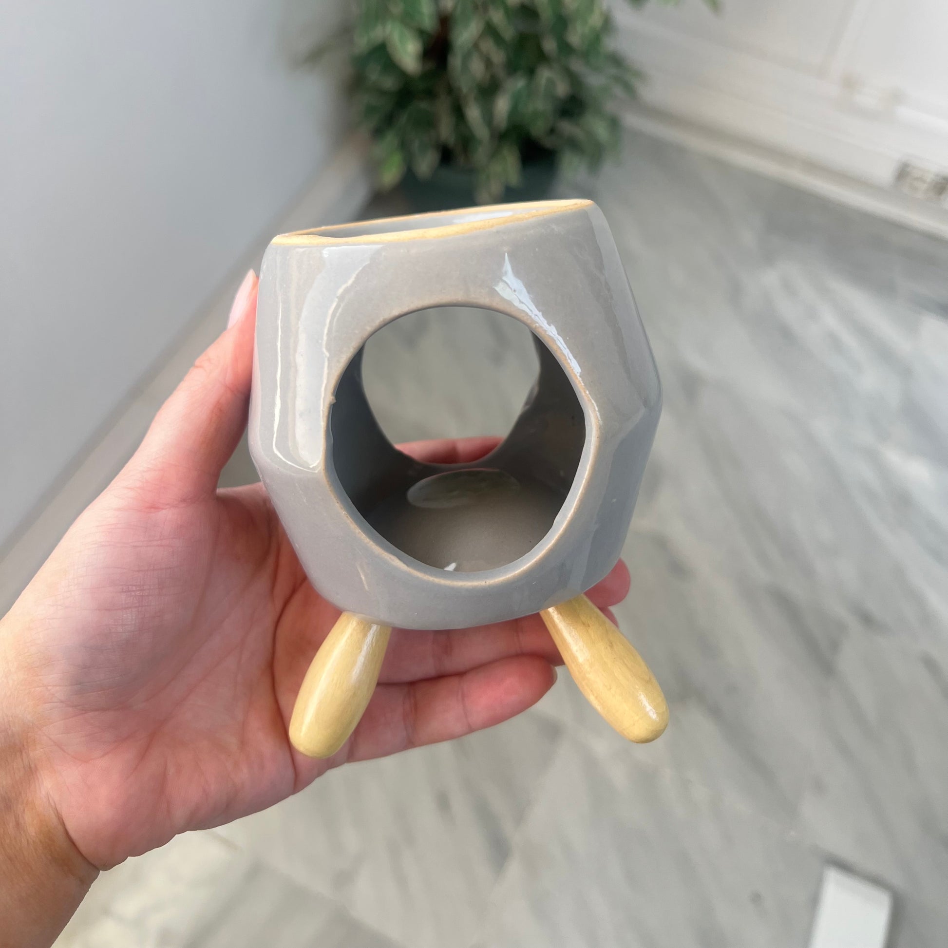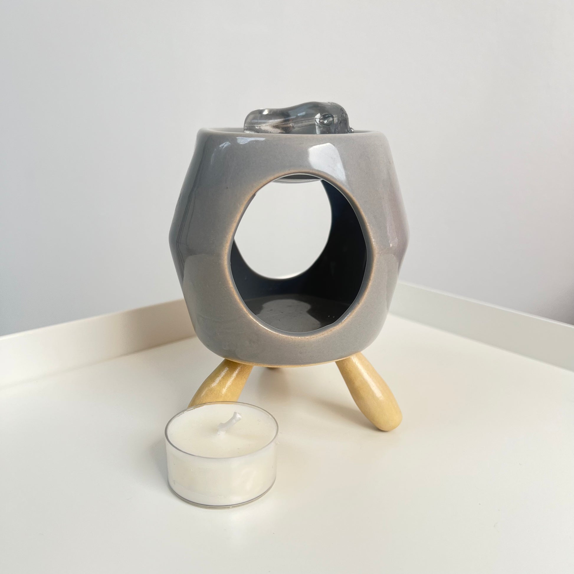 Nuestro nuevo quemador de cera de diseño minimalista es ideal para quienes buscan estilo contemporáneo sin renunciar a la calidez del aroma. Su estructura en dos piezas, con base cerámica gris y patas de madera natural desmontables, lo convierten en un verdadero objeto decorativo, perfecto para cualquier rincón de tu hogar.